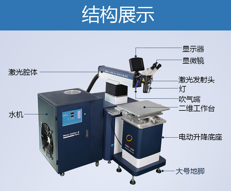 出口型模具激光焊機是通發激光公司專門為出口國外客戶使用而設計的系列機型TFL-200E,適用于各類精密注塑模具、壓鑄模具等模具激光修補焊接;同時也適合鑄件沙孔激光修補、模具崩缺激光修復、過切加工等的激光修補;各類金屬結構件、金銀首飾的激光焊接加工。