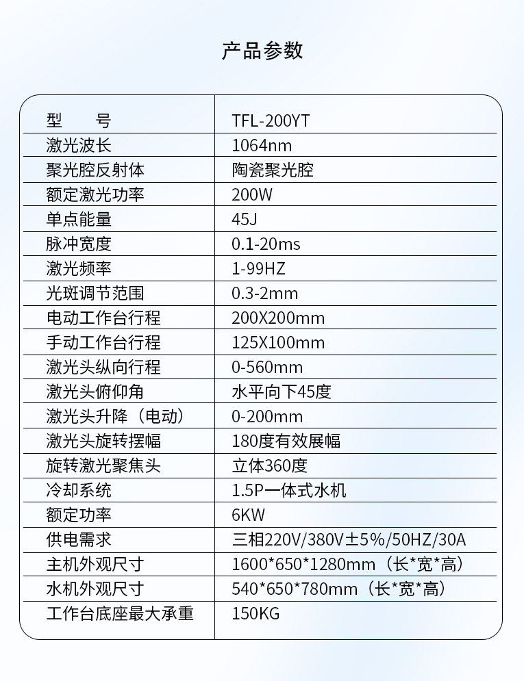 環(huán)境溫度:攝氏4度-攝氏32度。設(shè)備運(yùn)行時(shí),環(huán)境溫度不可以超過攝氏32度,因?yàn)榧す怆娫床糠郑β屎芨撸恍┕β势骷\(yùn)行時(shí)發(fā)出熱量需要及時(shí)散發(fā)出去,而環(huán)境溫度太高會(huì)導(dǎo)至不能正常散熱,會(huì)引起整個(gè)系統(tǒng)的工作不穩(wěn)定,甚至損壞。而冬天的時(shí)候,需要嚴(yán)防冷卻水結(jié)冰,因?yàn)榧す饩w、氙燈、聚光腔都充滿了水,結(jié)冰會(huì)直接導(dǎo)致這些器件的損壞。冬天時(shí)如長(zhǎng)時(shí)間不運(yùn)行情況下,將腔內(nèi)的水排空;如再開機(jī)前,先重新加水,打開電源空氣開關(guān),先行主機(jī)不開,只開水機(jī)空機(jī)運(yùn)行10分鐘,等水溫回復(fù)到攝氏4 度以上,再開主機(jī)。(強(qiáng)烈要求不能將設(shè)備放于室外或者低溫結(jié)冰的情況下使用,否則極易損壞設(shè)備)