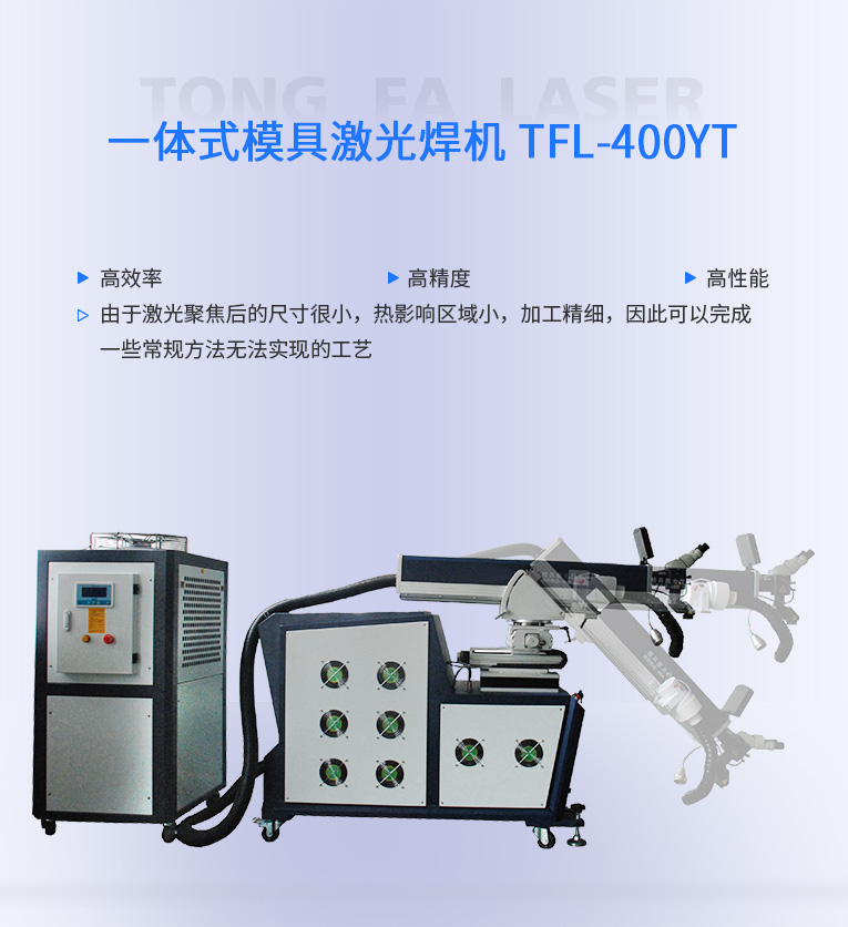 通發激光一體式模具激光焊機TFL-400YT是一款多種功能融合一體的新型模具激光焊接機,針對特大型塑料模具激光焊、中型注塑模具激光燒焊、小型塑膠模具激光補焊、壓鑄模激光補焊具等各類模具可實現超精密修復,幫您解決大型汽車模具修復難題,不需要模具移動,電動工作臺與立體旋轉激光頭完美結合,操作桿控制運動移動實現輕松激光修復大型模具,同時也保留了傳統手動工作臺超精密修復模具功能。