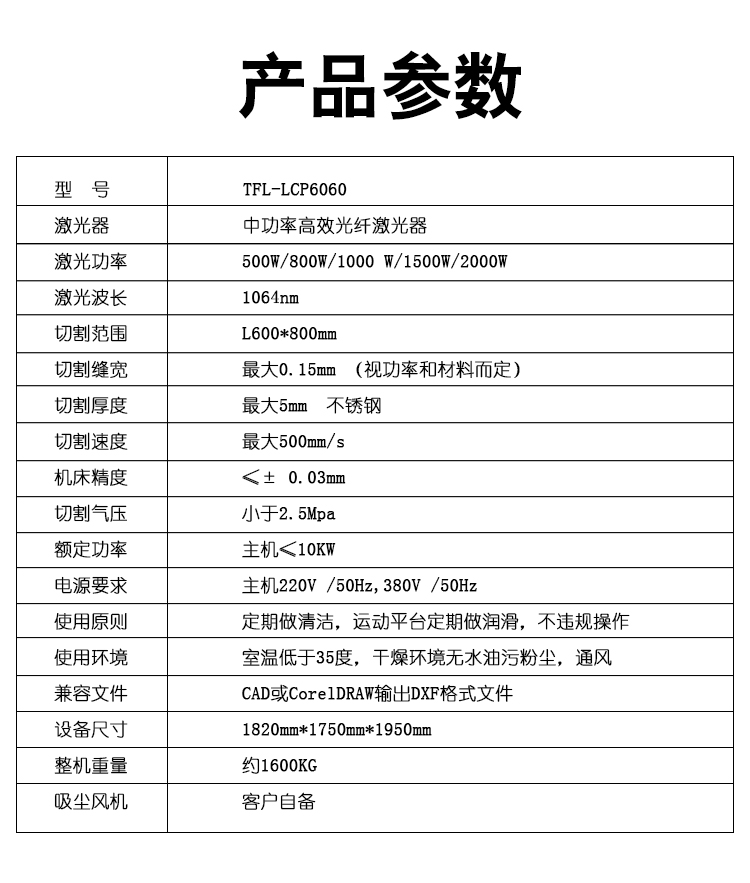激光功率 500W/800W/1000 W/1500W/2000W